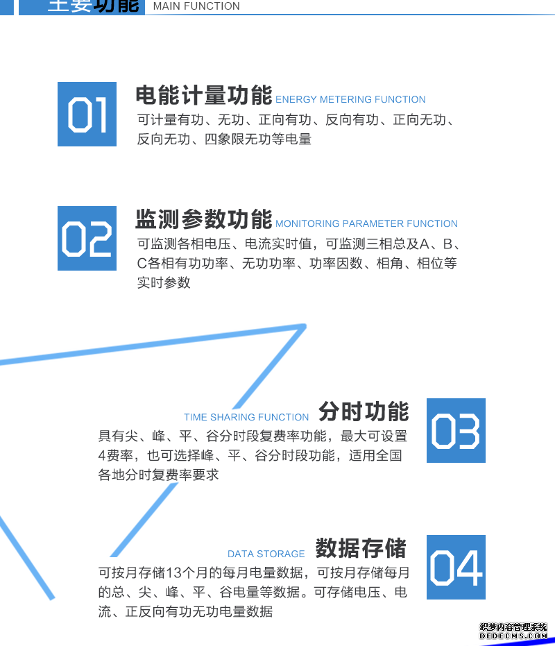 主要功能:有功,功率因素,有功功率,無功功能,四象限無功,電壓,電流,事件報警,載波,費控