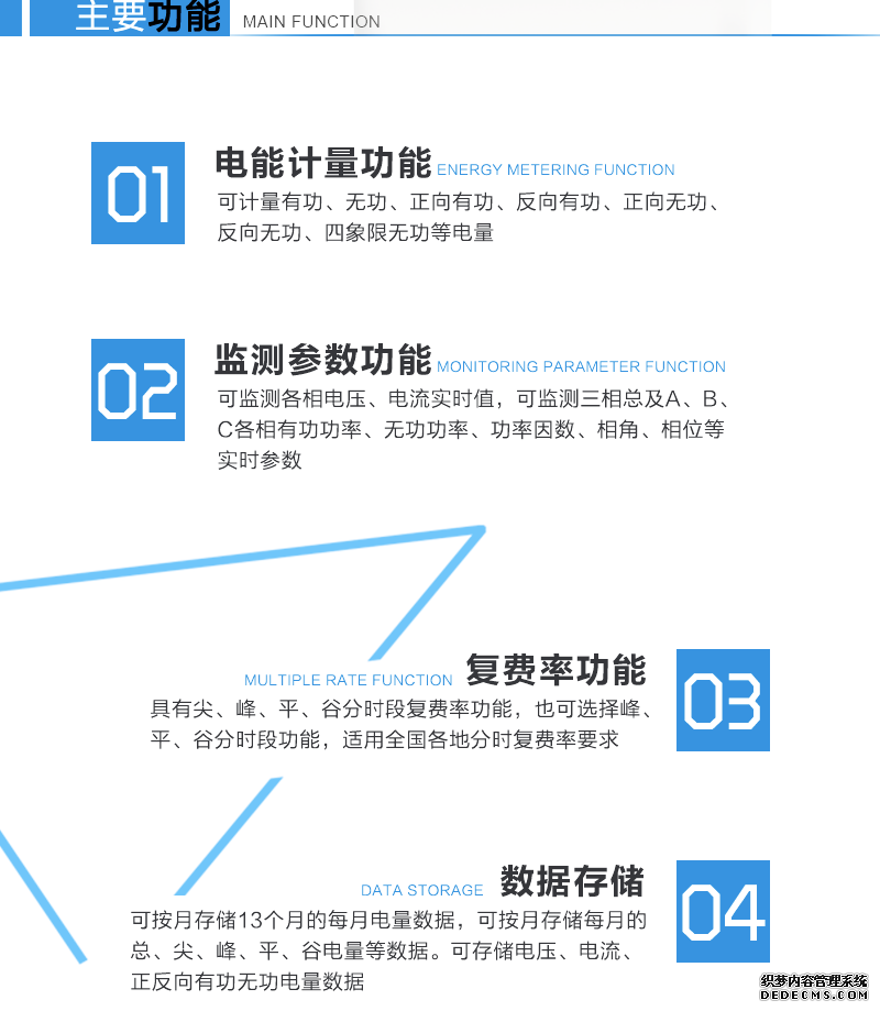 主要功能:有功,功率因素,有功功率,無功功能,四象限無功,電壓,電流,事件報警,需量
