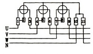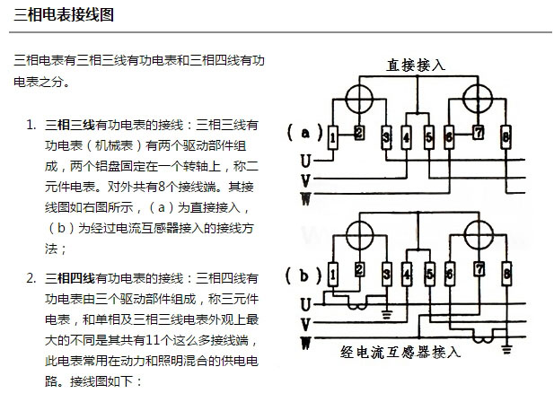 三線電表的接線方式并不復雜,只是電表的接線方式有很多,明白其原理只后,就會發(fā)現(xiàn)很簡單,下面就讓我們來介紹一下,三相電表如何接線。 上圖(左)為三相四線有功電表直接接入,火線U、V、W分別接在1、4、7端,3、6、9端接負載,零線接10號端,11號端接負載另一端, 那么這就是三相電表的接線方式,你學會了嗎?