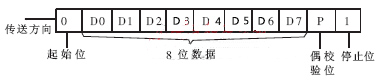 每字節含8位2進制碼,傳輸時加上一個起始位(0),一個偶校驗位和一個停止位(1),共11位,其傳輸序列如下圖: