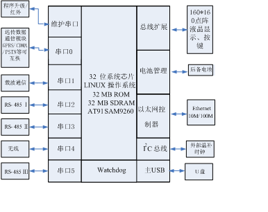 本產(chǎn)品由無線通信模塊與微處理器芯片、高精度實時時鐘、數(shù)據(jù)接口設(shè)備和人機接口設(shè)備組成。抄表方式可由RS-485與有相應(yīng)功能的表計裝置通信,把需要的信息抄讀回來傳給智能能源網(wǎng)關(guān),智能能源網(wǎng)關(guān)再通過上行通道GPRS/CDMA/SCDMA或以太網(wǎng)傳給上位機,讓上位機能夠及時的管理。上位機把需要的信息和命令下達(dá)給智能能源網(wǎng)關(guān),智能能源網(wǎng)關(guān)又把相關(guān)命令和信息通過同一條通道傳給外部表計裝置。其處理結(jié)果保存在數(shù)據(jù)存儲器中,并隨時向外部接口提供信息和進(jìn)行數(shù)據(jù)交換,其原理框圖如圖1-1所示。