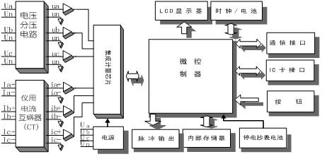 本產品由電流互感器、集成計量芯片、微控制器、溫補實時時鐘、數據接口設備和人機接口設備組成。集成計量芯片將來自電壓分壓,電流互感器的模擬信號轉換為數字信號, 并對其進行數字積分運算,從而精確地獲得有功電能和無功電能,微控制器依據相應費率 和需量等要求對數據進行處理。其結果保存在數據存儲器中,并隨時向外部接口提供信息 和進行數據交換,其原理框圖如圖 1 所示。