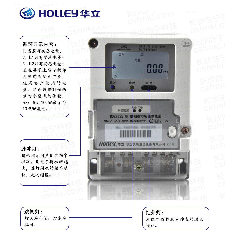 1. 脈沖指示燈:用來指示用戶用電功率狀況,用電負荷功率越大,該指示燈閃亮的頻率越快,反之越慢。當用戶不用電時,不亮。用電恢復后該燈繼續隨負荷功率的大小閃亮。