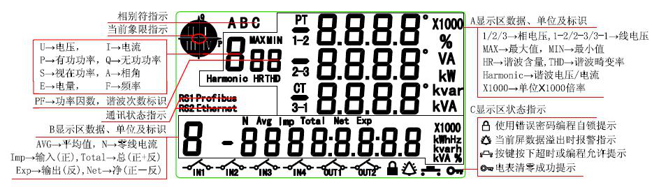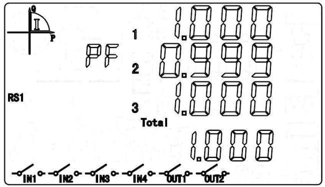 循顯模式下,按“”或“”鍵進入按顯模式。選定A區時,按“”或“”鍵切換至功率因數顯示項,圖中數據為:L1=1.000,L2=0.999,L3=1.000,總功率因數=1.000。