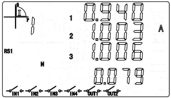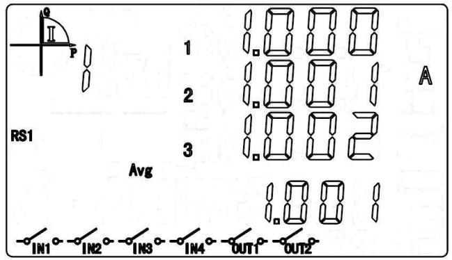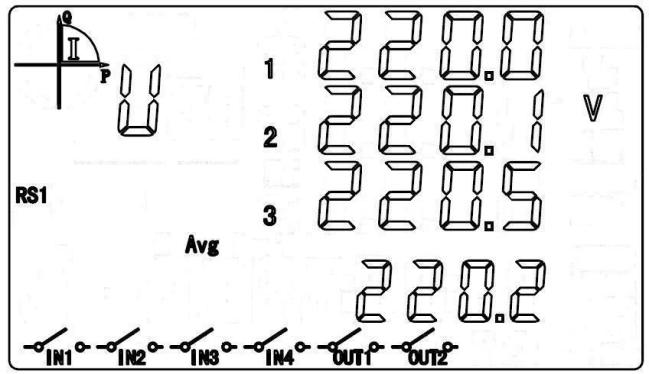 循顯模式下,按“”或“”鍵進入按顯模式。選定A區時,按“”或“”鍵切換至相電壓顯示項。圖中數據為:L1=220.0V,L2=220.1V, L3=220.5V,三相平均電壓=220.2V。 “RS1”提示有一路RS485口,若符號閃爍表示正在進行通信中;“