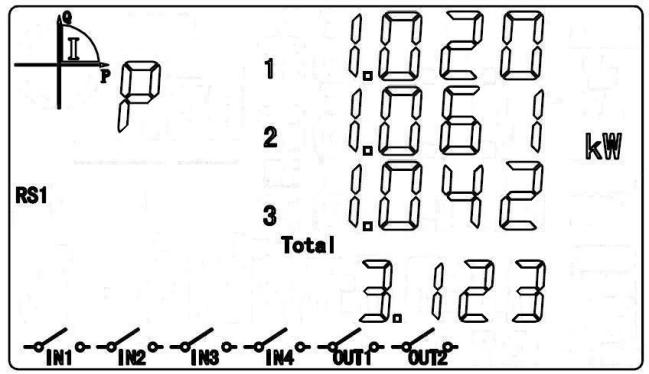 循顯模式下,按“”或“”鍵進入按顯模式。選定A區時,按“”或“”鍵切換至有功功率顯示項,圖中數據為:L1=1.020kW,L2=1.061kW,L3=1.042kW,總有功功率=3.123kW。