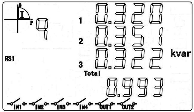 循顯模式下,按“”或“”鍵進入按顯模式。選定A區時,按“”或“”鍵切換至無功功率顯示項,圖中數據為:L1=0.320kvar,L2=0.351kvar,L3=0.322kvar,總無功功率=0.993kvar。