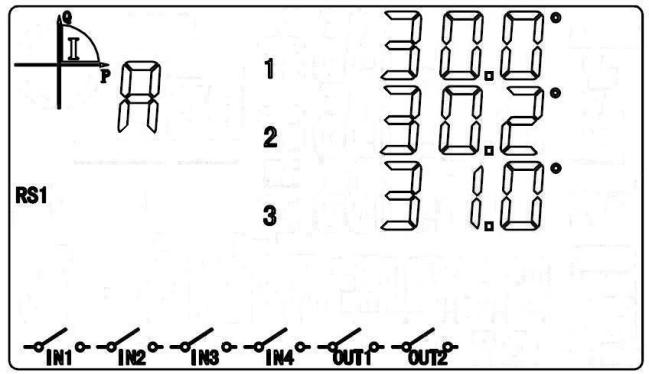 循顯模式下,按“”或“”鍵進入按顯模式。選定A區時,按“”或“”鍵切換至相角顯示項,圖中數據為:L1=30.0°,L2=30.2°,L3=31.0°。