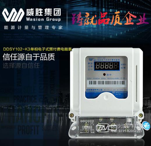 威勝電表DDSY102-K3單相電子式預付費電能表,又叫做定量電能表、IC卡電度表,除了具有普通電能表的計量功能外,特別的是用戶先買電,買電后才能用電,若用完電后用戶不繼續買電,則自動切斷電源停止供電。用于計量額定頻率為50Hz 的交流單相有功電能,實現先付費后用電的管理功能。采用先進的微電子技術進行數據采集、處理及保存,采用射頻卡傳遞數據。其性能指標符合GB/T17215-2002 和GB/T18460.3-2001 標準。具有體積小、安全性高、可靠性高、防竊電等特點。