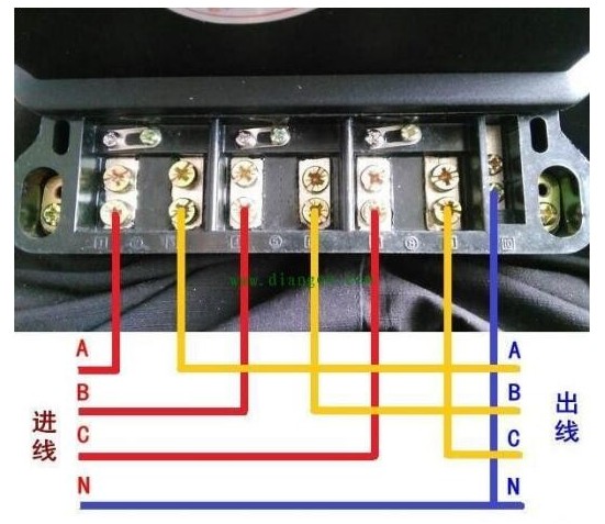 三相四線電表直通式接線的電表共有10個孔,其中1、2為同一孔,4、5為同一孔,7、8為同一孔,,1、 4、 7接線孔是A/B/C三相輸入口; 3、 6、 9 是A/B/C三相輸出口;