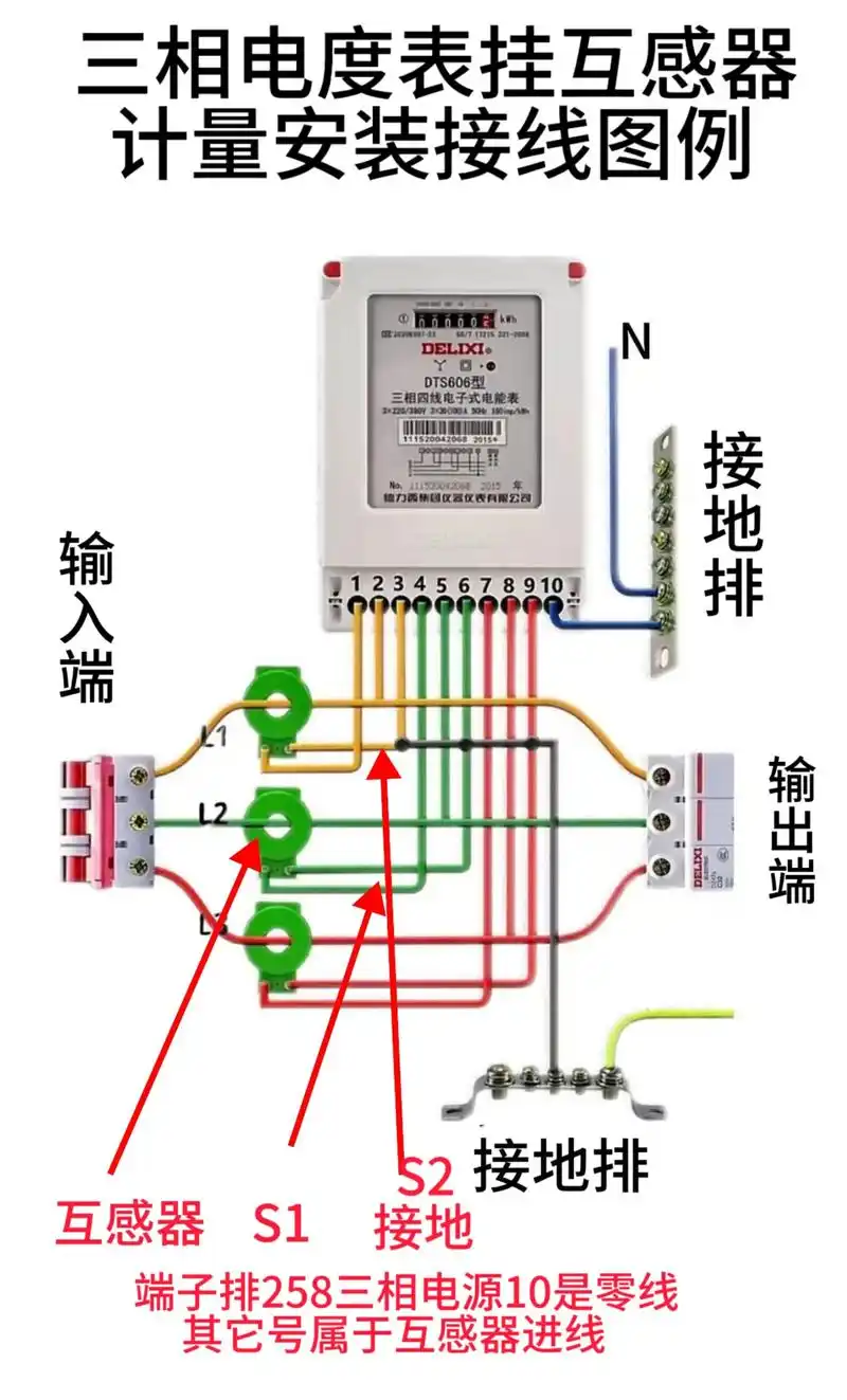 1.需借助電流互感器:三相火線(L1、L2、L3)先分別串聯一臺電流互感器的 “一次側”(P1 進、P2 出),互感器 “二次側”(S1、S2)再接入電表電流端子。 2.計量需換算:電表顯示數值需乘以互感器的變比(如 100/5A、200/5A),才是實際用電量(實際電量 = 電表讀數 × 變比)。 3.安全要求更高:所有互感器二次側的 “S2” 端子必須共同接地,防止高壓竄入電表,同時避免互感器開路產生危險高壓。